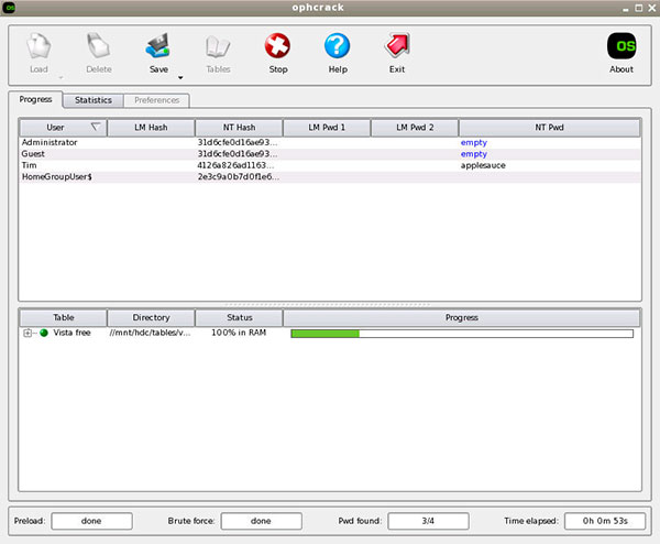 8. Ophcrack WILL NOT CRACK THE PASSWORD because the hash table which it needs is not available for free. But it does show the NTLM hash.